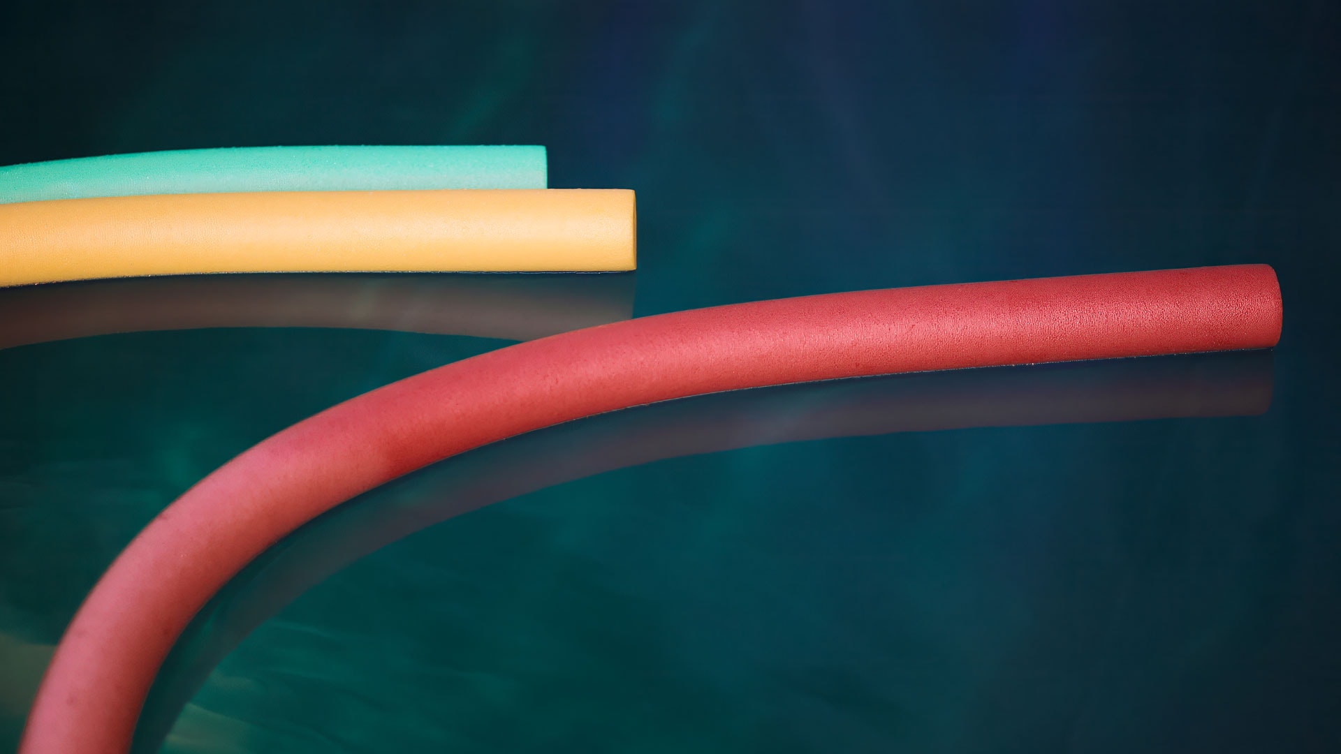 Badehanteln aus Schaumstoff in Rot, Gelb und Grün, perfekt für Wassergymnastik, Aquafit, Rehabilitation und Wassersport zum Muskeltraining und Konditionsaufbau im Wasser.